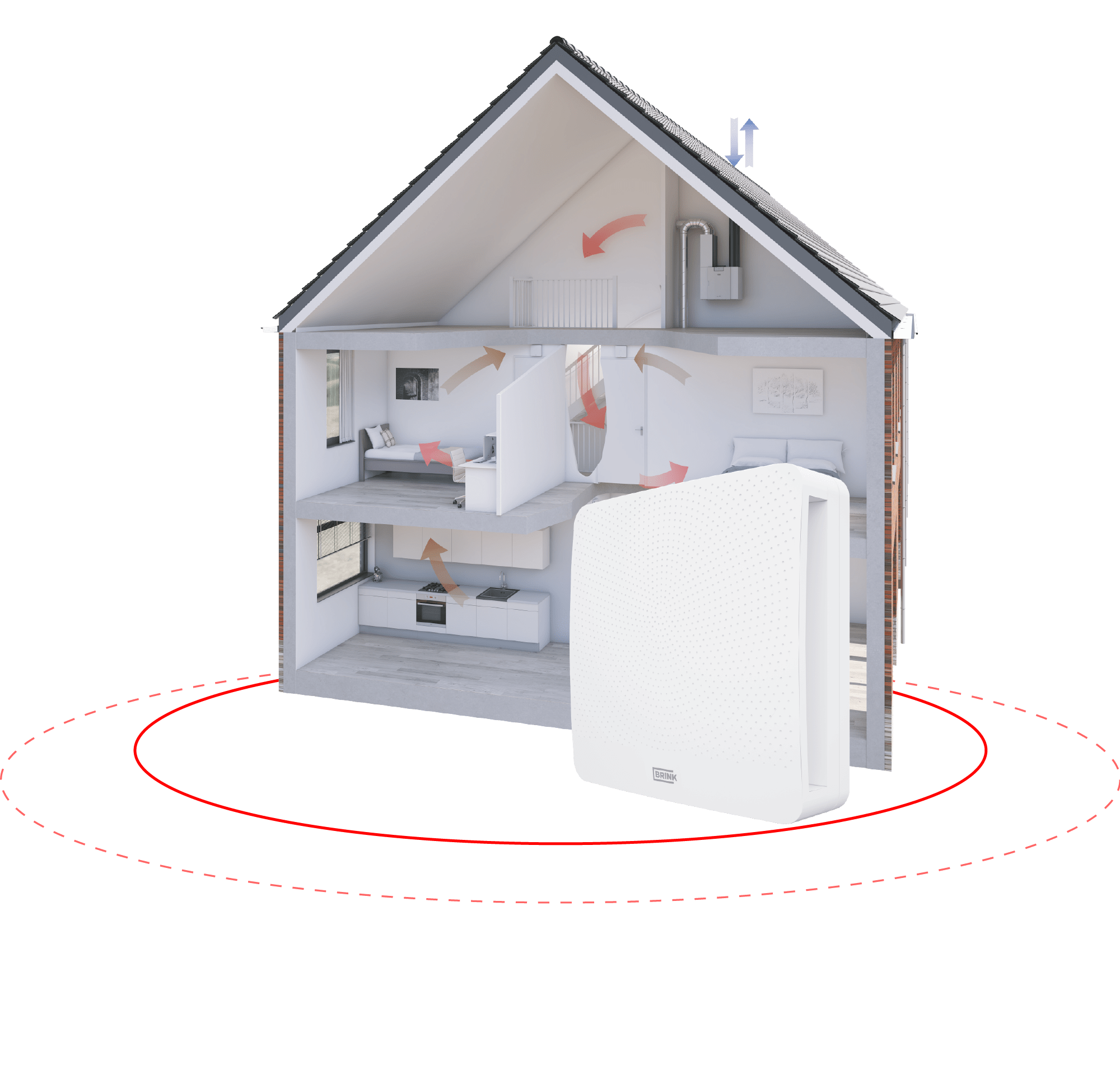 Voor bestaande woningen en renovatieprojecten is er het unieke en door ons ontwikkelde Multi Air Supply systeem. Deze combinatie van een Flair WTW toestel met CO2- gestuurde Indoor Mixfans zorgt voor schone en gefilterde lucht in huis zonder toevoerkanalen.